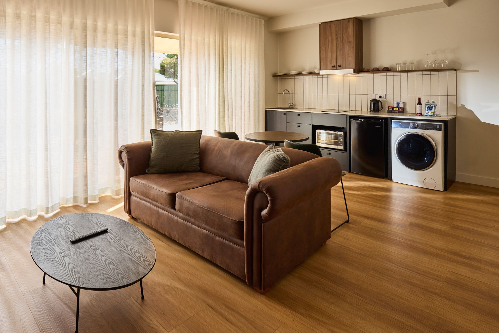 Step into a beautifully appointed One Bedroom Apartment, where contemporary comfort meets boutique charm. Unwind in a plush king bed and indulge in a spa-inspired bathroom featuring a walk-in shower and a freestanding bath. The stylish living area, complete with a queen sofa bed, opens onto a private balcony – perfect for enjoying your morning coffee or relaxing at sunset. A well-equipped kitchenette with a bar fridge, tea and coffee facilities, and convenient room service makes in-room dining effortless. Modern amenities, including a flat-screen TV, ducted heating and cooling, and complimentary Wi-Fi, ensure a comfortable and connected stay.